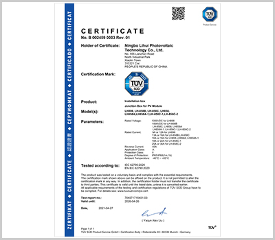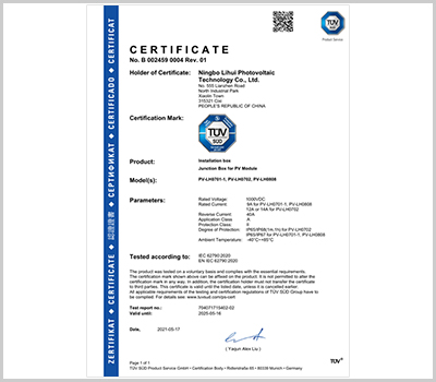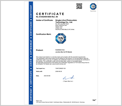 寧波市麗輝光伏科技有限公司成立于2010年,是一家專業(yè)從事太陽(yáng)能光伏接線盒、連接器、光伏線束等周邊產(chǎn)品研發(fā)、設(shè)計(jì)、銷售的企業(yè)。公司座落于中國(guó)杭州灣南岸對(duì)外經(jīng)濟(jì)開(kāi)發(fā)區(qū)的新興城市-慈溪市,產(chǎn)品通過(guò)TUV等認(rèn)證,企業(yè)通過(guò)ISO9001等管理體系認(rèn)證。現(xiàn)已形成多種系列光伏組件接線盒供應(yīng)能力,目前日產(chǎn)大組件光伏接線盒3萬(wàn)套、小組件光伏接線盒6萬(wàn)套。